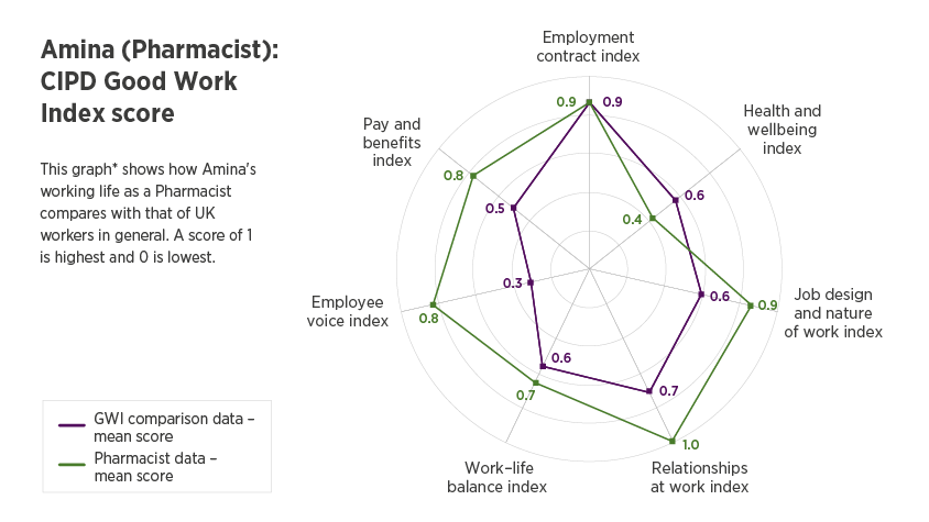 Case study from Pharmacist, Amina, on the highs and lows of working life and the different ways that job quality plays out in her experience