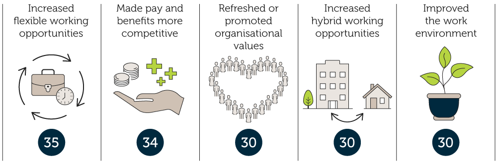 The non-profit sector was notably likely to increase flexible working, while public sector organisations were less likely to take action to improve pay and benefits and more likely to refresh or promote their values.
