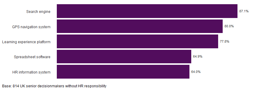 Did you know that artificial intelligence (AI) may be present in HR information systems (HRIS)? Or that it may be a background assistant in spreadsheet software, learning experience platforms, search engines or GPS navigation? Over half of the 814 UK bosses the CIPD surveyed (54.3%) didn’t know or think that AI could be present in at least one of these. Of those who thought AI could be present, fewer thought that it could be found in an HRIS and spreadsheet software compared to search engines (Figure 1).
