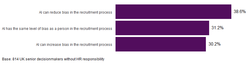 Focusing on AI use to mitigate bias in recruitment, 31.2% of respondents felt AI had the same level of bias as a person (Figure 3) – after all, people created AI and people have biases. A similar proportion thought that AI could actually increase bias (30.2%), but more bosses were optimistic that AI could reduce it (38.6%).