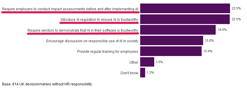 More broadly, we also asked bosses to choose their top three ways for ensuring AI is used responsibly at work. The pink lines in Figure 5 highlight the aggregated top three choices from our respondents (their first choice is three times the weight of their third choice). Requiring employers to conduct impact assessments before and after implementing AI is seen as important as introducing regulation to ensure AI is trustworthy. This is closely followed by requiring vendors to demonstrate that the AI in their software is trustworthy.