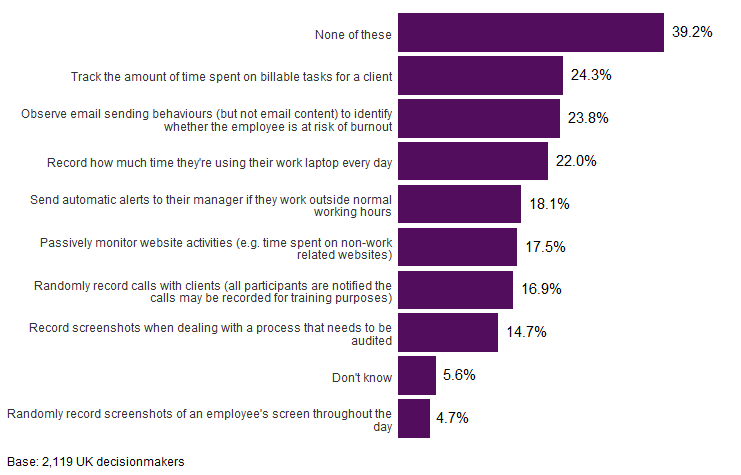 The three most accepted measures (selected by 44.8% of respondents) relate to how much time employees spend on their laptops and identifying risk of burnout. Some bosses seemed keen to mirror existing practices in the office for employees working from home. It’s possible that some see recording time spent on laptops as a replacement for using key cards to track attendance in the office.