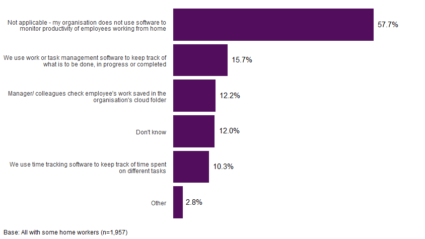• The majority (57.7%) said their organisations don’t use software to monitor home workers’ productivity, while 12% said they didn’t know.
