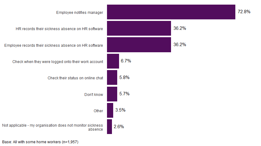 Notifying the manager or recording sickness absences on HR software are common ways of keeping track of sickness absence for homeworking employees (Figure 4). This practice is no different to what we would expect for employees who work onsite.