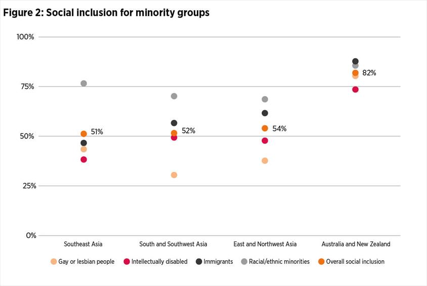 While some aspects of society in Asia are undergoing major changes, other dimensions have been resistant, reinforcing traditional norms. Figure 2 shows survey data highlighting attitudes across the Asia-Pacific region towards four social groups: racial or ethnic minorities, immigrants, people living with disabilities, and gender minorities. These results highlight how some regions continue to hold social beliefs that are discriminatory towards certain groups. For example, South-East Asia is relatively positive towards racial and ethnic minorities, but less tolerant towards immigrants, people living with a disability, and lesbian, bisexual, gay, transgender and queer+ (LBGTQ+) people. Compared with regional leaders Australia and New Zealand, the rest of the region still lags far behind, by around 30% in terms of average inclusion level of the four minority groups above.