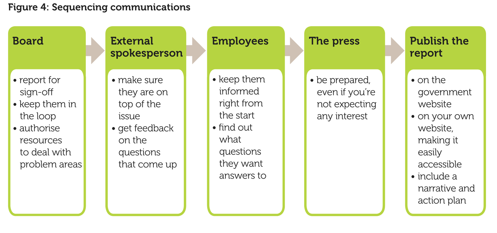 Sequencing is important. You don’t want the press hearing about your headline figures before your employees do. It is for you to decide on the timing and sequencing, but it will probably go something like the flow chart in figure 4.